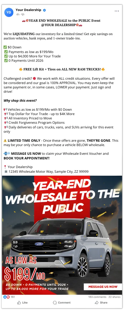 πππ Daily deliveries of cars, trucks, vans, and SUVs are being brought to our location exclusively for this Pre-Black Friday Wholesale Event. Vehicles must be sold β NO MATTER THE LOSS! Donβt let this opportunity slip away.